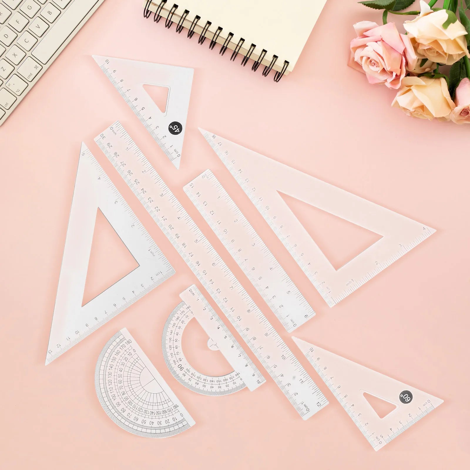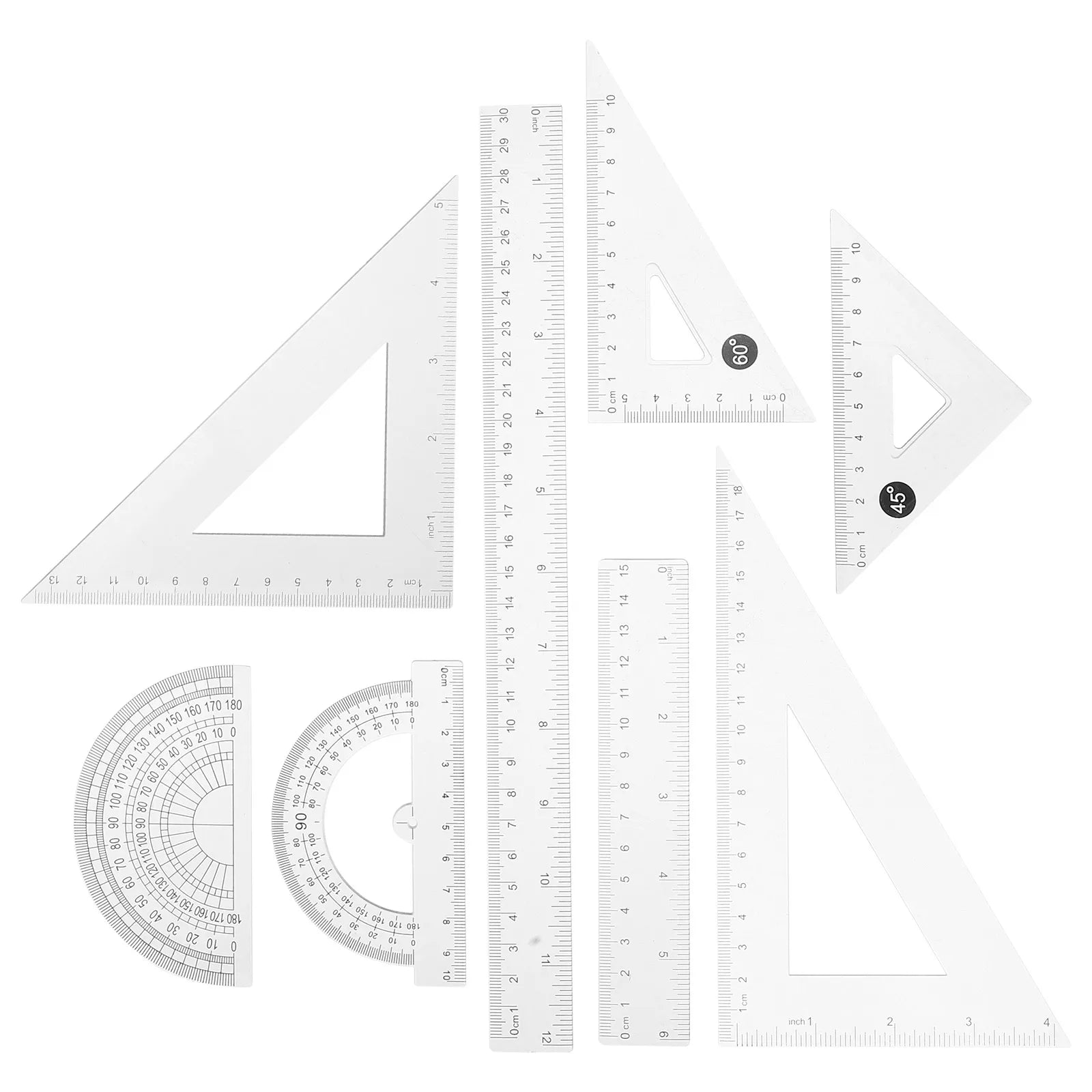 8pcs Transparent Ruler Set Clear Plastic Math Tools 15Cm 30Cm School Measurement Protractor Triangle Drafting Kit